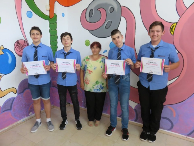 Учениците от 8а клас Стефан Стефанов, Петър Димитров, Искрен Тонов и Владимир Димитров се класираха на трето място на националния кръг на състезанието по информационни технологии IT ЗНАЙКО в категория Уеб екипи.