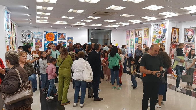 По стените на огромната изложбена зала само тук-там се виждаше стена от плътно наредените една до друга детски картини, тематично подбрани с изключителното умение на Снежана Велчева. Цветове, форми, материи, стилове - всичко аранжирано така, че да събуди възхищение, да нахрани сетивата, да те накара да чувстваш колко си жив.