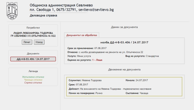 При първият дъжд след ремонта, Лидия и Ангел разбрали, че имат проблем. Написали жалба до Общината с молба за бърза реакция. Приложили и снимки на мократа фасада. Жалбата е заведена на 24 юли 2017 г. Справка в деловодната система на Община Севлиево показва, че към 5 януари 2018 г. статусът на жалбата е „чакаща“.