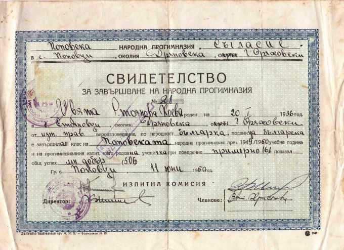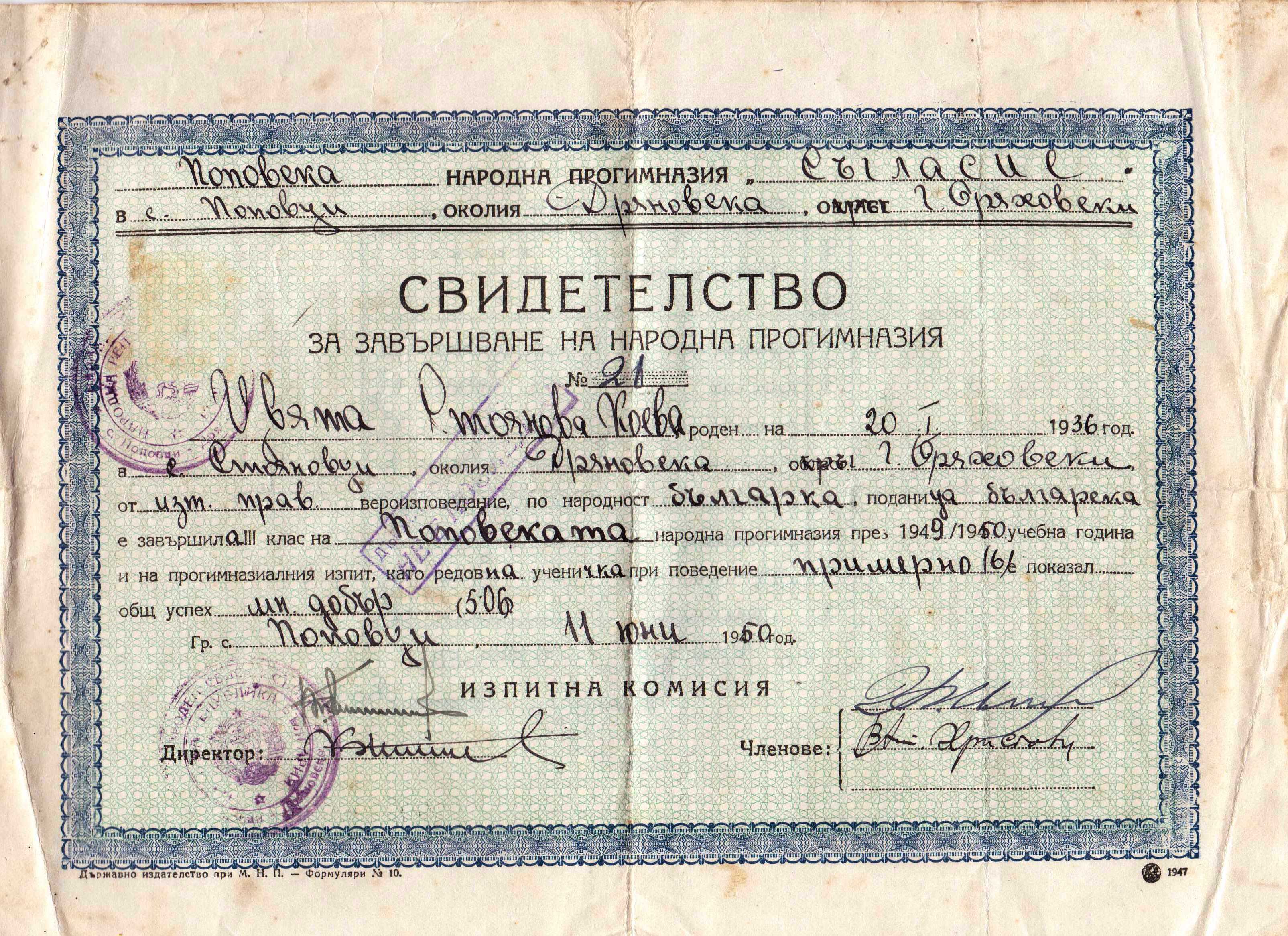 Свидетелство от Поповската народна гимназия, датата е ден преди края на учебната година