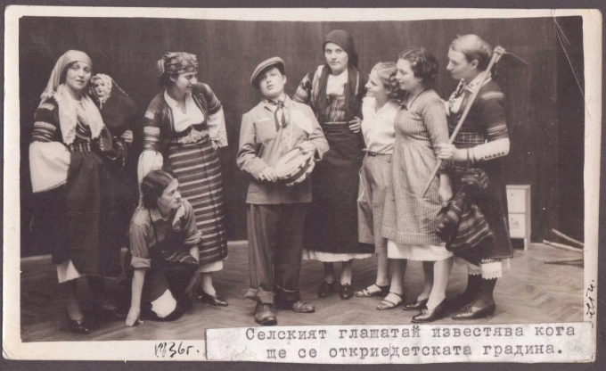 Детски спектакъл, в който се показва как селският глашатай съобщава за откриване на детска градина, 1936 година