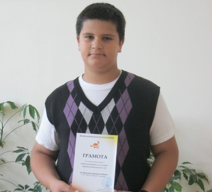 Четвъртокласникът на СУ "Васил Левски" Кристиян Пашов се класира на първо място в националния кръг на международното състезание "Лингвистично кенгуру". Успехът е изключителен не само за момчето, но и за училището, тъй като за първи път ученик от началния етап на образование достига до призово класиране на национално ниво.