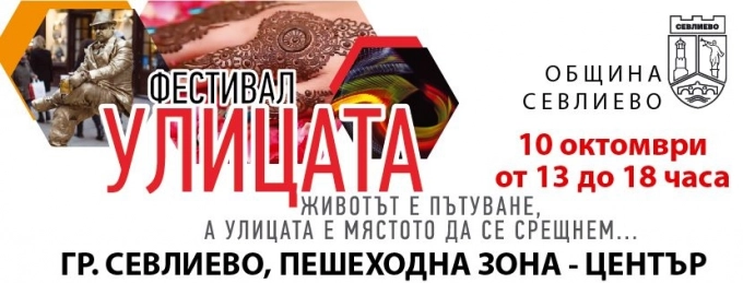 Пътуващ фестивал “Улицата" ще изпълни пространството на централната пешеходна улица на 10 октомври в рамките на “Празници на Севлиево”. От 13:00 до 18:00 часа жителите и гостите на града ще могат да се насладят на тяхното изкуство и да научат повече за него в пряк досег с хората, които умело владеят “Улицата” - събитие, обединяващо местни и гостуващи артисти, представящи своето изкуство и практики под открито небе, в които посетителите могат да бъдат и участници.