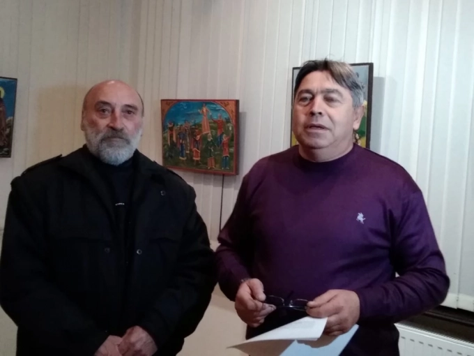 Директорът на ГХГ "Асен и Илия Пейкови" Васко Василев /вдясно/ представя художника Петър Първанов