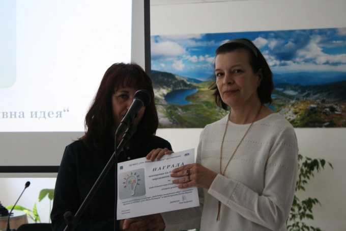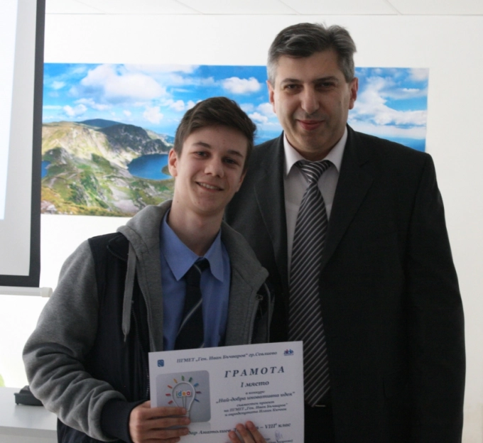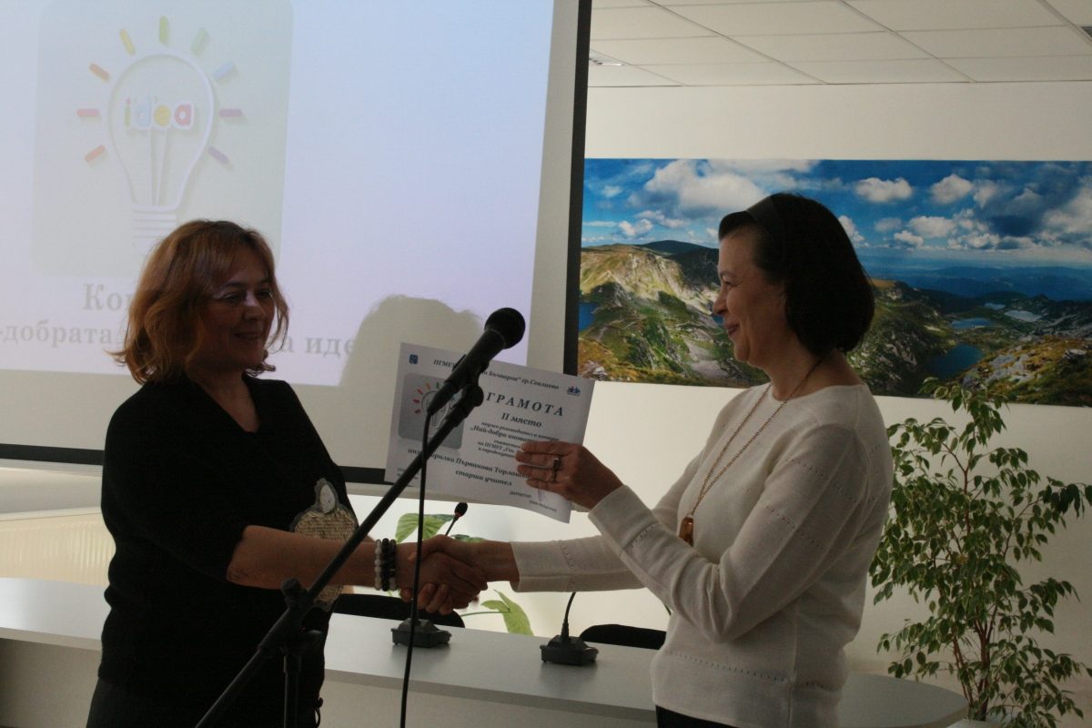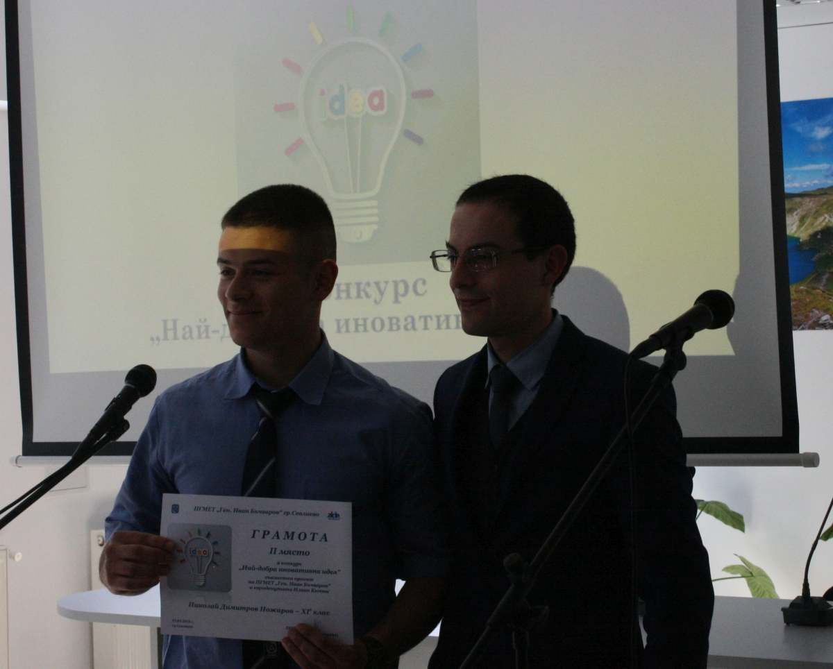 Директорът на гимназията Ани Андреева поздрави учениците, участвали в конкурса за най-добра иновативна идея, като подчерта, че той мотивира младите хора да мислят и творят. "Искахме да ви провокираме да видите един обект или явление от друг ъгъл, и вие се представихме повече от добре", каза Андреева, преди да връчи отличията на своите колеги - научни ръководители.