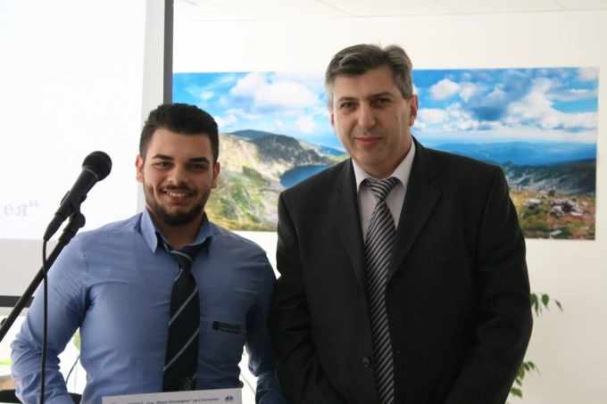 Николай Ножаров спечели едно първо и едно второ място - първо за новацията колело за сняг, второ за макета "Тандем - колело за двама", грамотата му връчва Ювер Муса - сътрудник на Илхан Кючюк