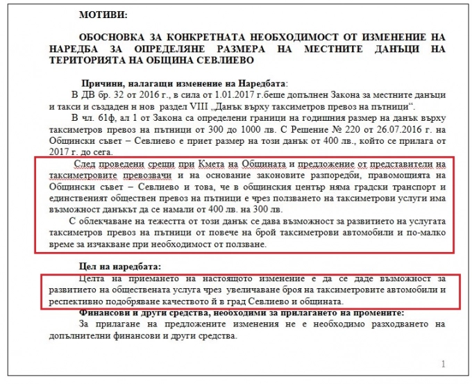 Един от мотивите за данъчното облекчение, е че в Севлиево няма градски транспорт и единственият обществен превоз на пътници са таксиметровите услуги. Според общинската администрация „има възможност данъкът да се намали от 400 лв. на 300 лв.“, а „с облекчаване на тежестта от този данък се дава възможност за развитието на услугата таксиметров превоз на пътници от повече на брой таксиметрови автомобили и по-малко време за изчакване при необходимост от ползване“.