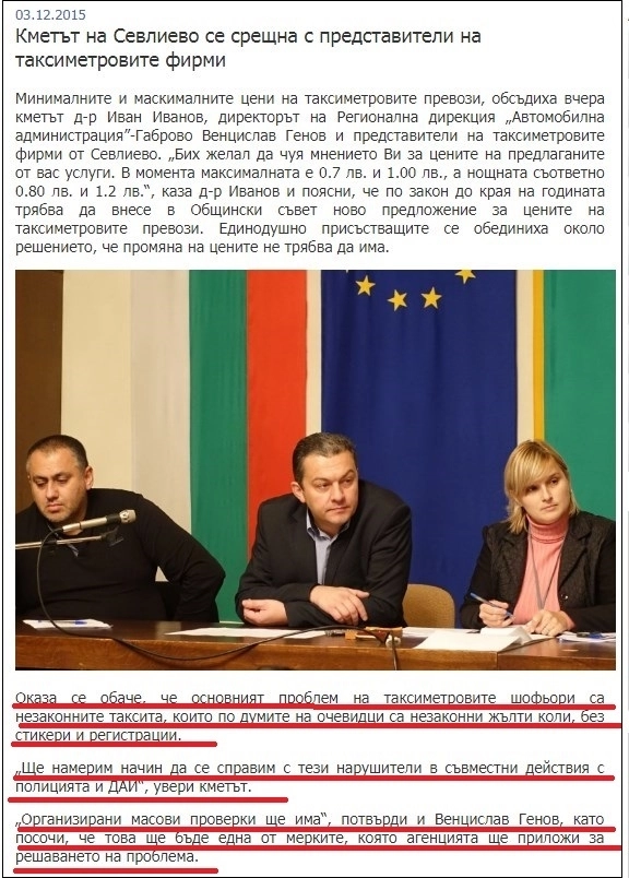 Скрийншот от интернет сайта на Община Севлиево, където през януари 2015 г. е публикуван ангажимента на кмета да се справи с незаконните таксиметрови превозвачи