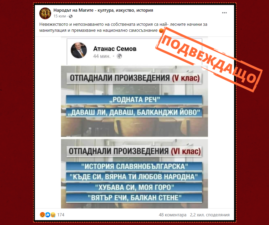 В последните два месеца масово се тиражират неверни и подвеждащи твърдения за отпаднали произведения от учебните програми. Различни публикации във Фейсбук споменават едни и същи произведения – „Даваш ли, даваш, Балканджи Йово“, „История славянобългарска“, „Вятър ечи, Балкан стене“ и др., за които се твърди, че отпадат от учебната програма. Публикациите внушават че „родоотстъпници“ премахват умишлено възрожденски творби с цел „обезбългаряване“ на учениците. Според част от подвеждащите публикации намерението е „премахване на национално самосъзнание“, като „дебългаризират и отродяват децата ни“.