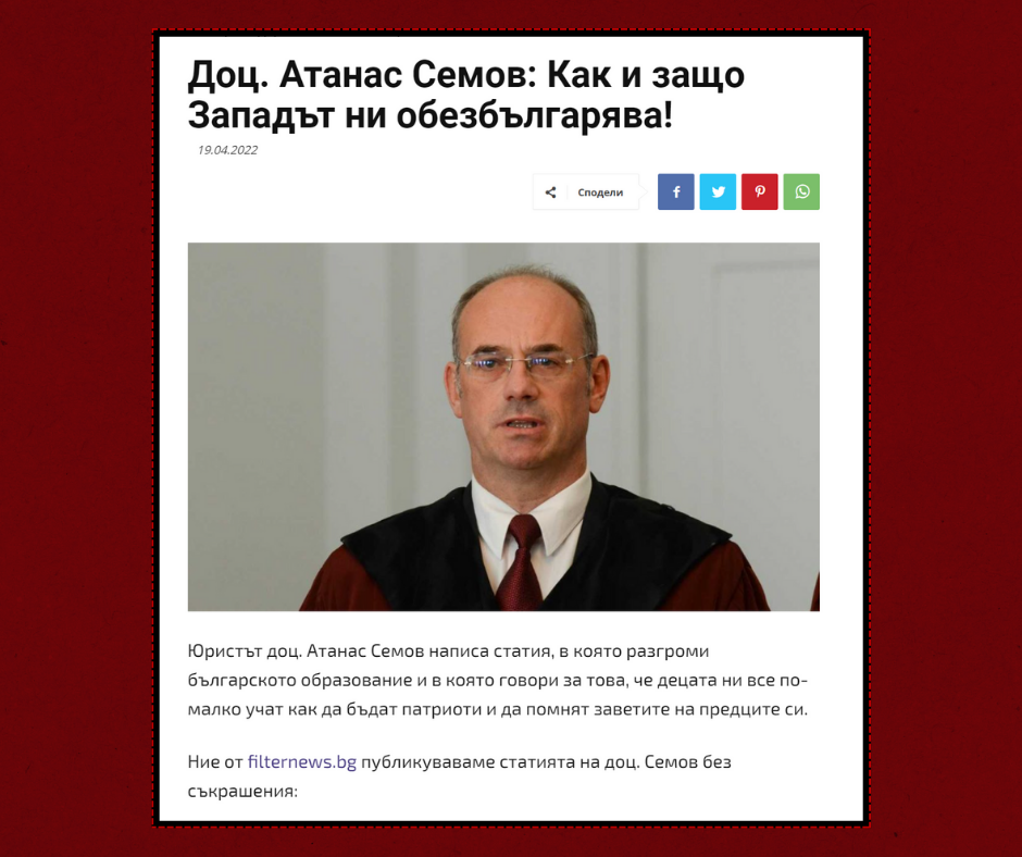 Т.нар. „Забранена статия“ е налична в профила на Атанас Семов, който е професор по право в Софийския университет „Св. Климент Охридски“ и конституционен съдия. В текста се твърди, че „от учебната програма отпада „Балканджи Йово”, че са „изхвърчали“ „История славянобългарска“ и „Записки по българските въстания“, че в учебника по Български език за четвърти клас „няма нито 1 ред от Вазов или Ботев! Нито един!!!“. Според автора “това е съзнателно и продължително осъществяван процес на изтриване на българската идентичност” и на “обезбългаряване”.