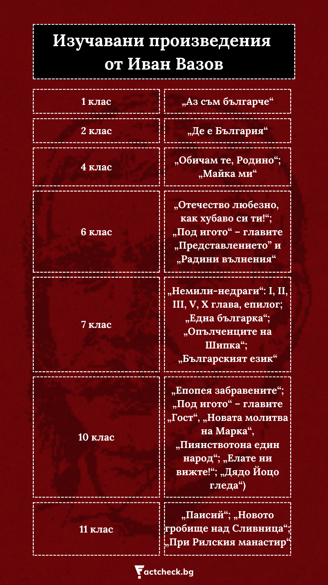 Проверката на Factcheck.bg не откри в учебната програма само две от изброените в публикациите произведения – „Родната реч“ на Иван Вазов и „Записки по българските въстания“ на Захари Стоянов. До момента на публикуването на този текст не сме получили отговори на изпратените до Министерството на образованието въпроси.