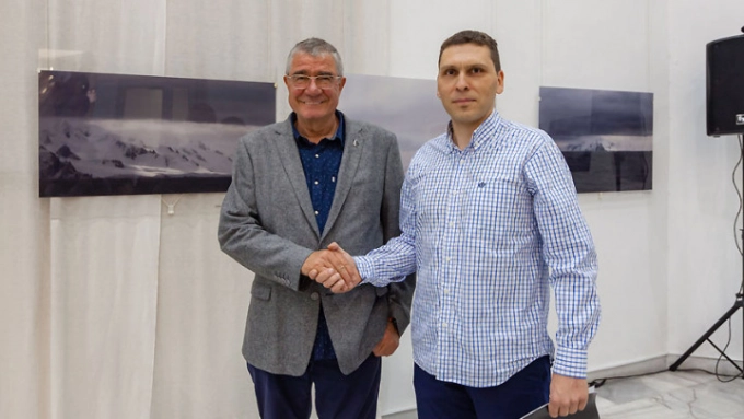 Проф. Христо Пимпирев и инж. Мирослав Цветанов на откриването на изложбата „Антарктика – поглед от другата страна на света” във Велико Търново, снимка: Генчо Петков, БНР