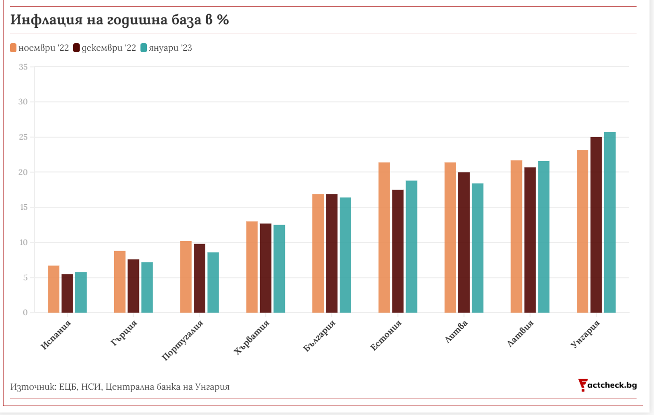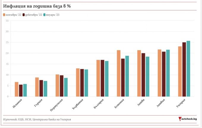 През януари Хърватия отчете годишна инфлация от 12.5% спрямо януари 2022 г. Тя е по-ниска спрямо предходните месеци, след като достигна пик от 13% през ноември. Макар това ниво на инфлация да е над средното за еврозоната, то е по-ниско в сравнение с много други държави в ЕС. Това означава, че Хърватия единствена сред изброените от Корнелия Нинова държави наистина може да служи за илюстрация на тезата й, че таванът на цените не е задължително да води до скок на инфлацията.