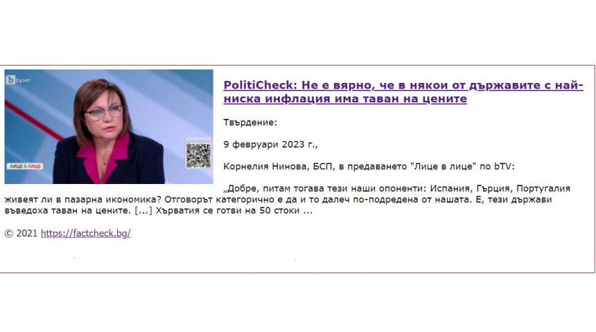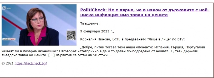 Казаното от Корнелия Нинова в предаването “Лице в лице” на 9 февруари съдържа неверни, неточни и подвеждащи твърдения. Не е вярно, че някои от държавите с най-ниска инфлация в ЕС имат действащ таван на цените на определени продукти. Посочените от Нинова Испания, Португалия и Гърция не са налагали таван на цените на стоки от първа необходимост. Такава мярка е въведена върху 9 продукта в Хърватия, но не се обмисля тя да обхване 50 стоки. Инфлацията в Балтийските държави действително е висока, но не чак толкова, колкото твърди лидерът на БСП.