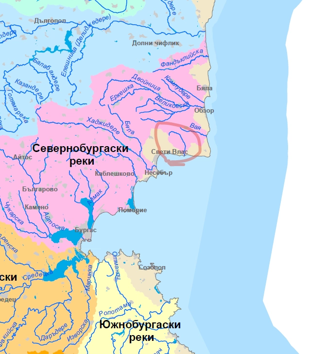 Карта на основните речни басейни в Черноморски район, публикувана в ПУРБ „Черноморски район“ 2022-2027. Река Дращела е оградена с червено.