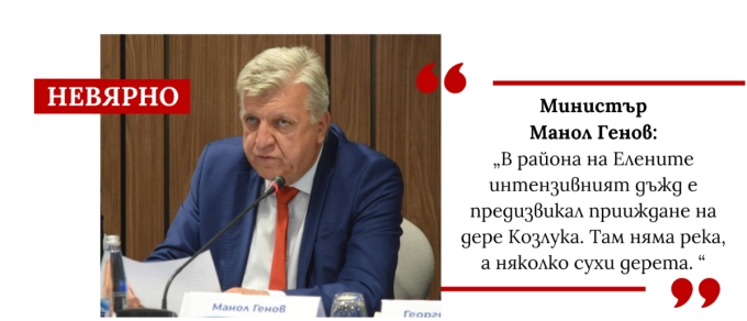 „В района на Елените интензивният дъжд е предизвикал прииждане на дере Козлука. Там няма река, а няколко сухи дерета. Разпоредих проверка на Басейнова дирекция „Черноморски район“, за да се установи дали инвестиционните намерения, които са реализирани в района, са съгласувани”, каза министър Манол Генов.