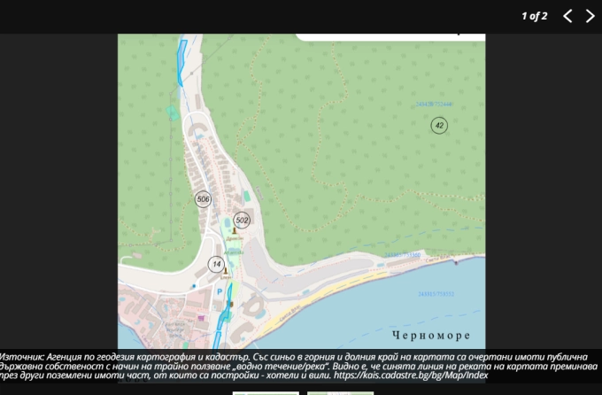 Проверка в кадастъра показва, че река Дращела е отбелязана и там. В началото на вилното селище откъм планината реката е обособена в поземлен имот 11538.506.3. Посочено е, че става дума за публична държавна собственост. „Вид територия Урбанизирана, НТП Водно течение, река, площ 2687 кв. м“, се посочва още в кадастъра. Този имот обаче граничи с частни имоти, през които видно от картата преминава водното течение. Последният поземлен имот с начин на трайно ползване „водно течение/река” е близо до плажа и има идентификационен номер 11538.506.39.