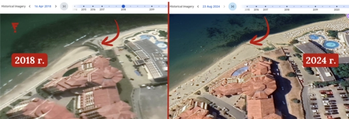 Вляво: Снимка от пролетта на 2018 г., когато реката е сравнително пълноводна и ясно се вижда къде се влива в морето. Вдясно: Снимка от лятото на 2024 г., следата от реката е едва забележима.