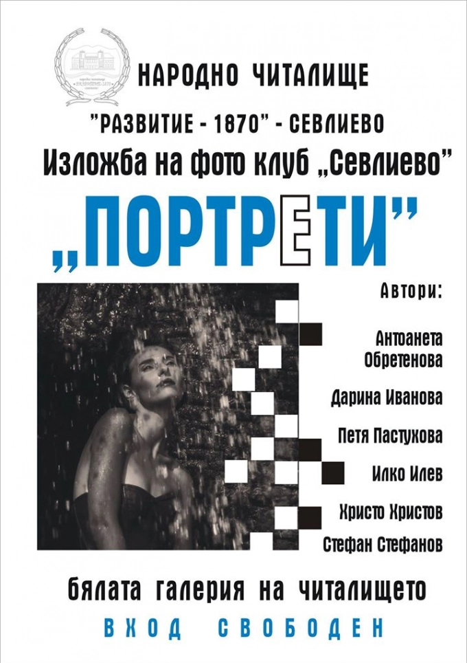 На 12 април от 18.00 часа читалище "Развитие-1870" открива фото-изложба на фото клуб "Севлиево". Изложбата е озаглавена "Портрети", а авторите, които ще покажат свои фотографии са членовете на клуба Антоанета Обретенова, Дарина Иванова, Петя Пастухова, Илко Илев, Христо Христов, Стефан Стефанов.