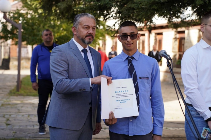 Кметът Иван Иванов отличава съименника си Иван Иванов от ПГМЕТ, снимка: Божидар Генков