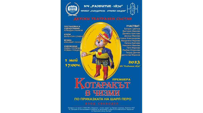 На премиера на спектакъла „Котаракът в чизми” канят актьорите от Детския театрален състав при Народно читалище „Развитие-1870”. Куклената постановка ще се състои на 1 май от 17:00 ч. в читалищния салон.