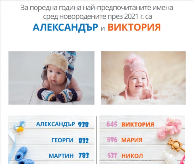 Според Националния статистически институт през 2021 г. най-предпочитаните имена за новородени са били Александър и Виктория. Следват Георги и Мария, Мартин и Никол.
