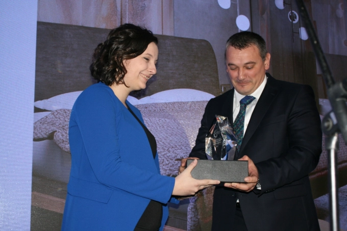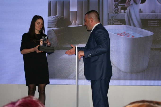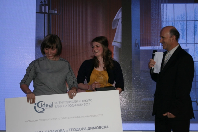 Изпълнителният директор на завода за санитарна керамика Валентин Ганев връчи наградата на публиката на Десислава Лазарова и Теодора Димовска в категорията "Баня във ваканционен хотел"