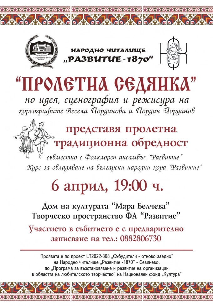 Проявата е по проект LT2022-308 „Събудители – отново заедно” на Народно читалище „Развитие-1870” – Севлиево, по „Програма за възстановяване и развитие на организации в областта на любителското творчество” на Национален фонд „Култура”.