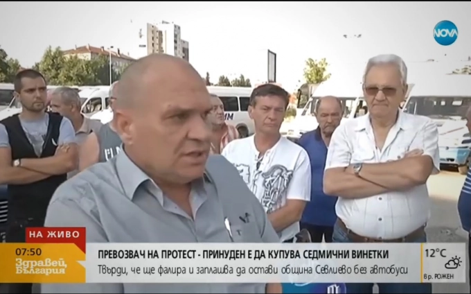 В знак на протест срещу рекета от страна на държавата, която принуди собствениците на коли за товарен и пътнически превоз да купуват само едноседмични винетки, колите, които изпълняват линиите от общинската транспортна схема на община Севлиево пътуват без винетки. "Няма да приема, че отивайки на пазар искам да си купя краставица, а търговецът ще ми каже: купи си ряпа!", коментира образно ситуацията Пламен Боевски, собственик на фирмата, която изпълнява 80% от лините в общината.