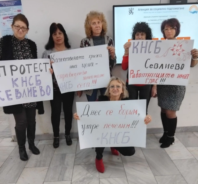 Днес служители от дирекциите „Социално подпомагане“ в Габрово и Севлиево и служители от „Български пощи“ в Габрово излязоха на протест пред сградите на институциите в знак на солидарност със своите колеги от страната, които по това време участваха в организираната от КНСБ акция в столицата под надслов „НЕ на разединението на работещите! ДА на по-високите доходи!“.