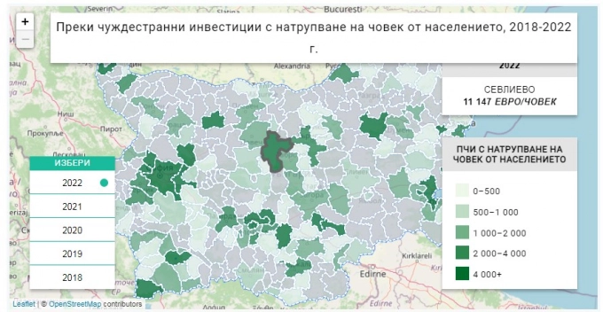 Близо 11 150 евро на човек от населението е разпределението на чуждестранните инвестиции в община Севлиево, сочи още проучването, като се отчита, че това разпределние дава представа за относителната роля на чуждите капитали в местните икономики.