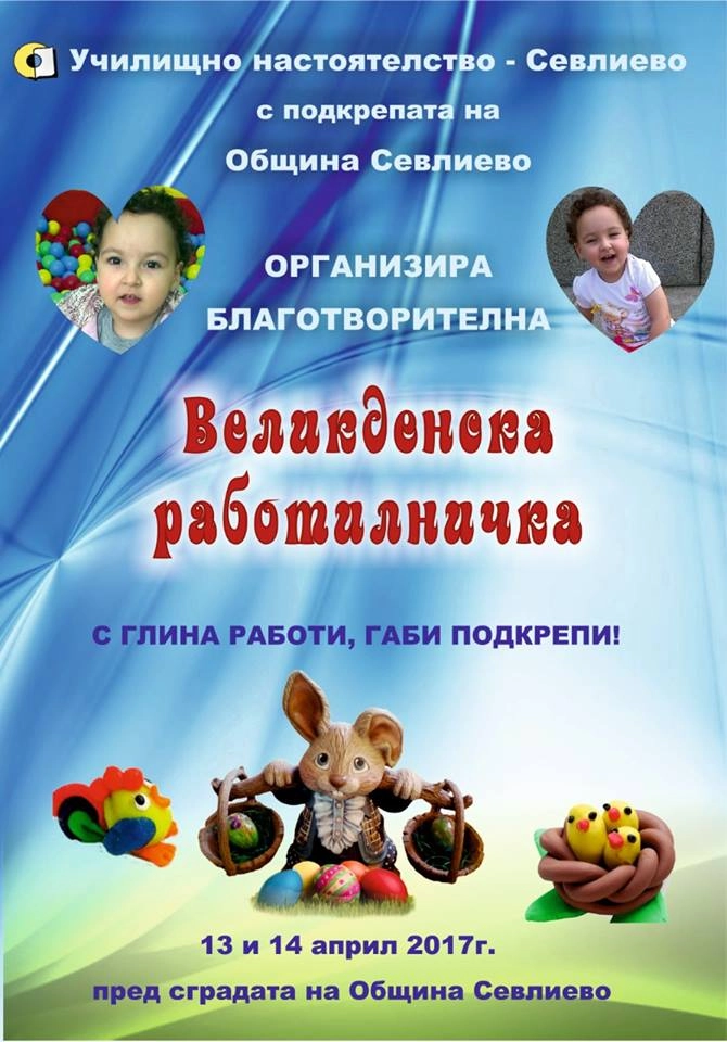 Идеята за великденската работилничка е на Училищно настоятелство Севлиево, подкрепена от Община Севлиево. На нея всеки, който има желание, въображение и талант, ще може да изработи предмет от глина. А средствата за глината, ще отидат за Габи. Така хем ще може да се създаде изкуство, хем едно дете ще бъде подпомогнато в продължаващата битка с детската церебрална парализа.