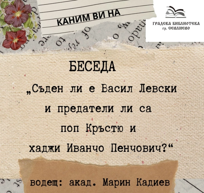 На 18 февруари 2026 г. се навършат 153 години от смъртта на Васил Иванов Кунчев - Левски, Апостолът на свободата. По този повод Градската библиотека в Севлиево кани на разговор, воден от академик Марин Кадиев, по тема „Съден ли е Васил Левски и предатели ли са поп Кръстю и хаджи Иванчо Пенчович“.
