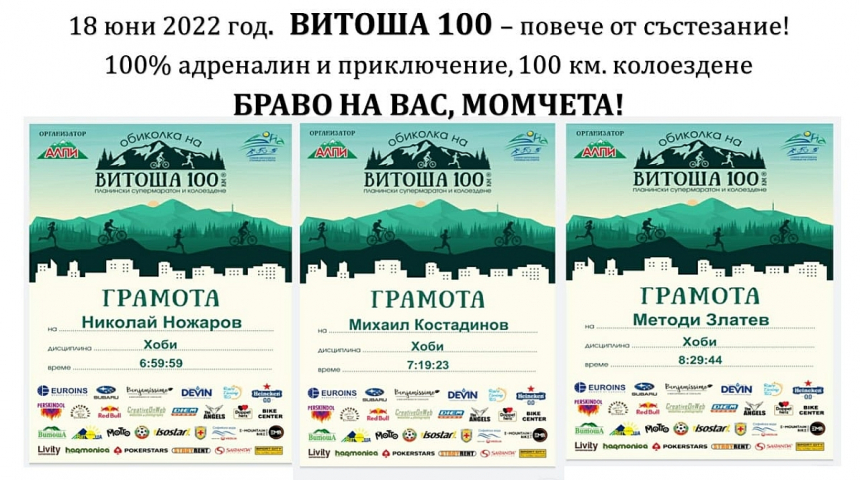 С най-добро време стокилометровата обиколка на планинаната приключи Николай Ножаров. Той единствен от Севлиево преодоля трасето за по-малко от 7 часа, макар да бе на косъм да премине тази граница. Времето му е 6 ч., 59 минути и 59 секунди.
