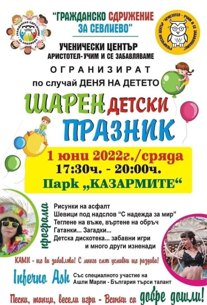 На 1 юни парк "Казармите" в Севлиево ще стане място за среща на детските усмивки, смеха, веселието, пъстротата и радостта от детското безгрижие. За всичко това гарантират организаторите от Гражданско сдружение за Севлиево и Учебен център "Аристотел".