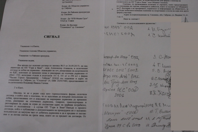 Конкретен повод за сигнала е договор за добив на дървесина, сключен на 26.09.2017 г. между общинско предприятие „Земи и гори“ и „Частно горско предприятие Габрово“. Съгласно проектодоговора, който е част от документацията по тръжната процедура, „Частно горско предприятие Габрово“ се задължава да извърши изпълнение по добив, представляващ сеч и извозване на маркираната дървесина до временен склад, рампиране на отсечената дървесина, товарене, транспортиране и разтоварване на дърва за огрев до адреса на крайния потребител“. Крайният потребител в случае е общинското предприятие „Земи и гори“ в Севлиево. „Никъде в проектодоговора не е заложено изпълнителят да закупува част от добитата дървесина и да я продава от негово име и за негова сметка на трети лица, които не са предмет на договора“, пише в сигнала.
