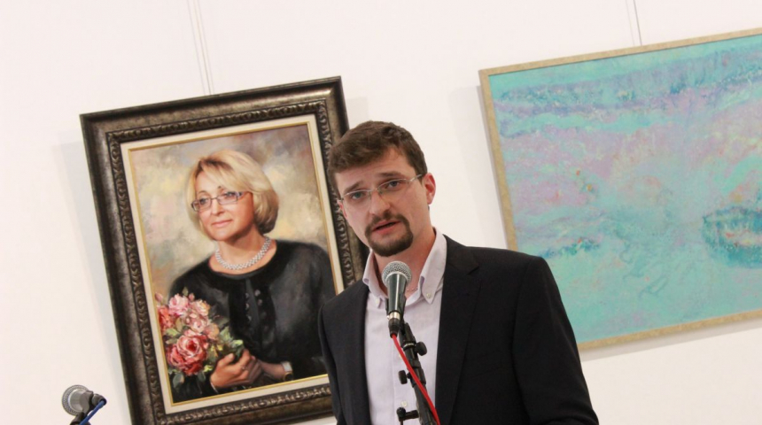 Сава Христов - днешният управител на галерия "Видима" пред портрет на Ирина Колбасова, първият управител на галерията в продължение на 20 г., снимка: Деяна Денева