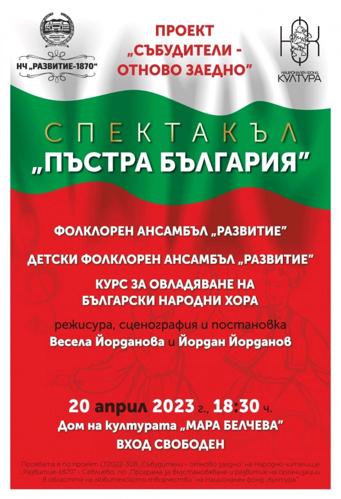 Осмото чудо на света – българския фолклор, представя спектакъла „Пъстра България”. Поредицата с фолклорни концерти се реализира като част от дейностите по проект „Събудители – отново заедно” на Народно читалище „Развитие-1870”, финансиран по Програмата за възстановяване и развитие на организации в областта на любителското творчество на Национален фонд „Култура”.