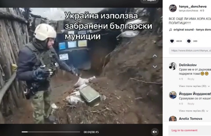 Видео, публикувано в ТикТок, твърди, че в завладени от руската армия украински територии са открити „забранени български муниции“. Във видеото човек във военна униформа, който се намира в окоп, показва пред камерата кутия с ВОГ-17 – муниции за гранатомети. Той твърди, че те са открити в превзети украински позиции и че са произведени в България. Оригиналният текст на видеото е на руски, но в горния десен ъгъл на кадрите е добавен надпис на български, който гласи „Украйна използва забранени български муниции“.
