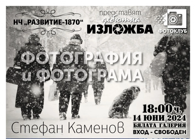 В двудневен фотомаратон в Севлиево фотографът Стефан Каменов ще представи дебютна фотоизложба „Фотография и фотограма”. Откриването е на 14 юни, от 18:00 ч., в Бялата галерия на читалище „Развитие-1870”.