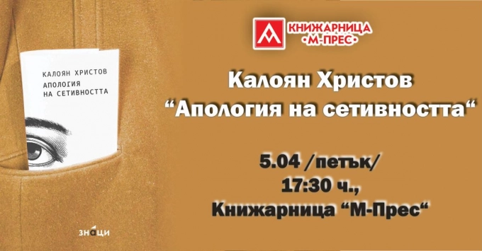 На 5 април 2024 г. (петък) от 17:30 ч. в книжарница “М-Прес” ще бъде представена новата стихосбирка на поета Калоян Христов „Апология на сетивността“.