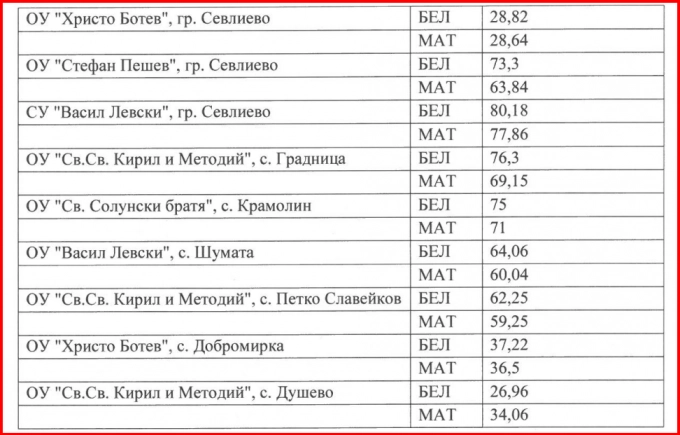 Три училища са с отчетливо по-високи резултати, показва справка, изготвена за "Севлиево онлайн" от Регионалното управление на образованието в Габрово.