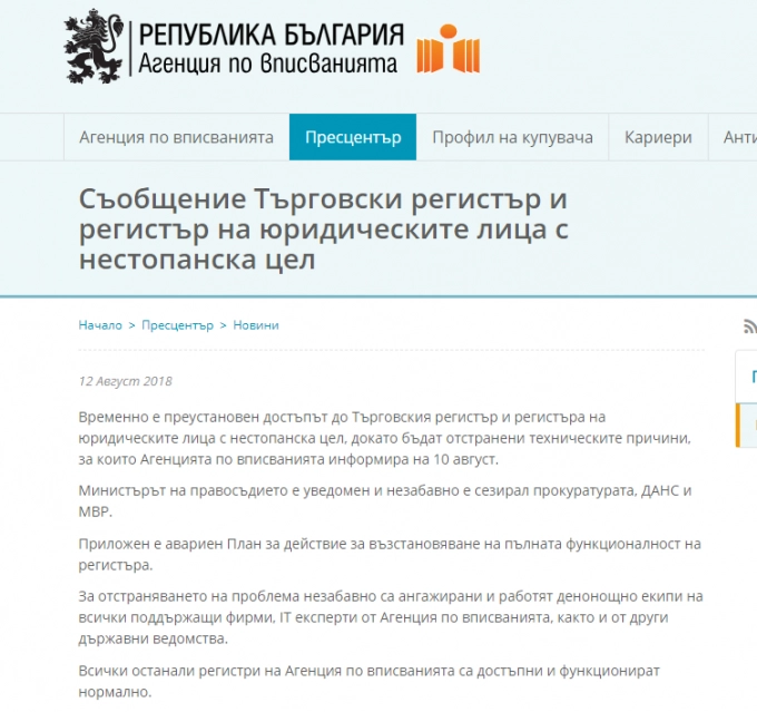 Търговският регистър спря да бъде активен на 10 август т.г., а на страницата на Агенцията по вписванията се появи информация, че става дума за технически проблем. По-късно същия ден от агенцията уточниха, че на 11 и 12 август няма да могат да се подават онлайн документи към регистъра, което не остави съмнение, че проблемът е сериозен и отстраняването му няма да стане толкова бързо, колкото се очакваше.