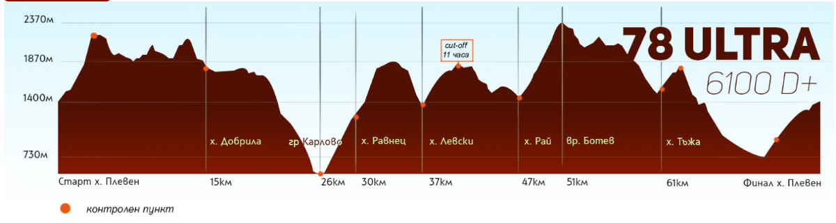 За кратко састезателното трасе минава през Карлово като пресича първия мост и продължава за хижа Равнец. След хижата - по южните склонове на масива Равнец, после следва равна поляна със скала. Следват хижа Васил Левски, хижа Рай, след което маратонците тръгва нагоре по Тарзановата пътека за вр. Ботев. Оттам им предстои дълго билно бягане на изток до х. Тъжа. След хижата се изкачват по тревист склон без ясно изразена пътека до вр. Марагидик. Спускането от върха е изключително предизвикателно и изисква голяма техничност, защото в тъмната част на денонощието е трудно за ориентиране.