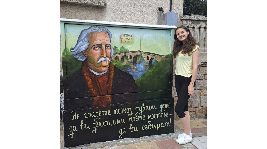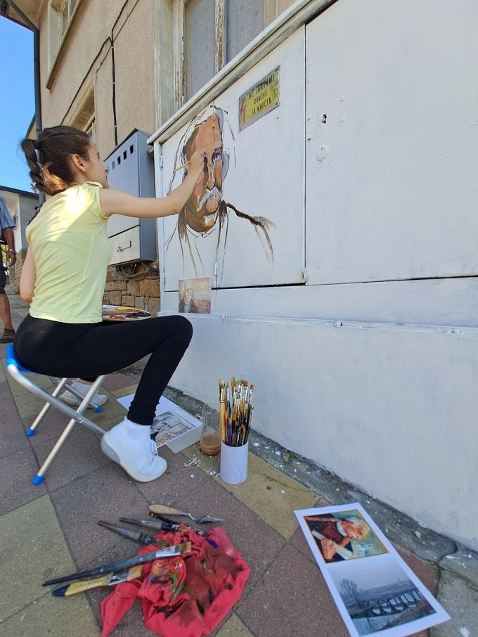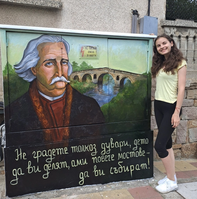 Теодора Маринова, студентка по специалността "Живопис" във Великотърновския университет, изрисува електроческо табло на ул. "Станционна" 8 в Дряново с лика на майстор Колю Фичето и каменния мост над р. Дряновска.