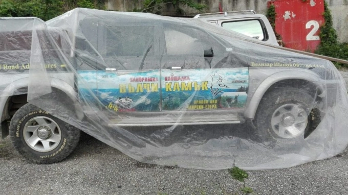 Върху джипа, с който катастрофираха Мустафа, Джанер и двете семейства от София, е изписън телефонът на зам.-председателя на ОбС Девин Велизар Шанов, който отрича да е извършвал нерегламентиран превоз, снимка: "Отзвук"