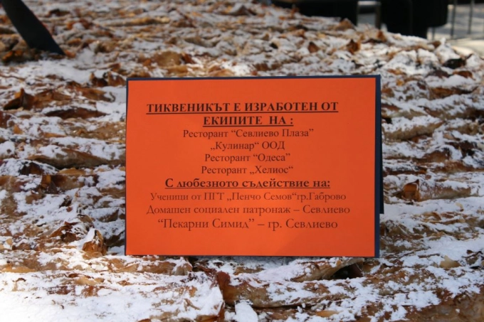В приготвянето се включиха готвачи от ресторантите на хотел "Севлиево плаза" и "Хелиос, от парти зона "Кулинар" и ресторант "Одеса". Тази година им помагаха ученици от Професионалната гимназия по туризъм "Пенчо Семов" в Габрово и Домашния социален патронаж.