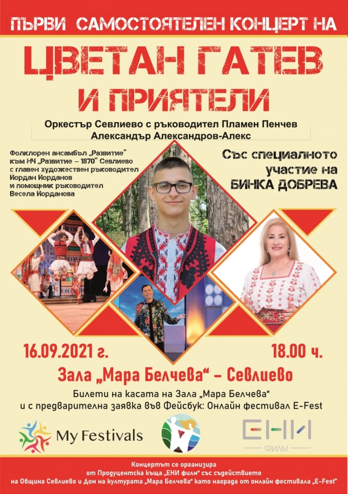 Младият изпълнител Цветан Гатев кани приятели и любители на хубавата българска музика на своя първи самостоятелен концерт. Събитието е планирано за 16 септември от 18 ч. в Дом на културата „Мала Белчева“ в Севлиево.