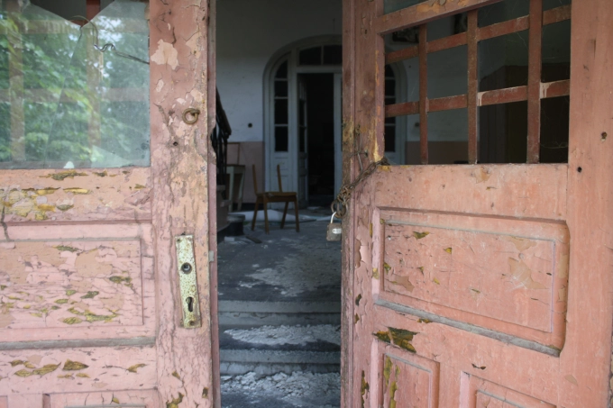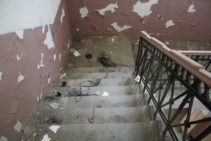 На края на коридора на втория етаж оставам без думи. Ясно ми е, че тази сграда, за която Общината прави няколко опити да продаде, вероятно едва ли ще има нов стопанин. Една трета от покрива се е срутил в едното й крило и е въпрос на време да пропадне и целият втори етаж.