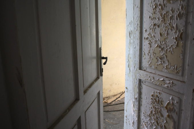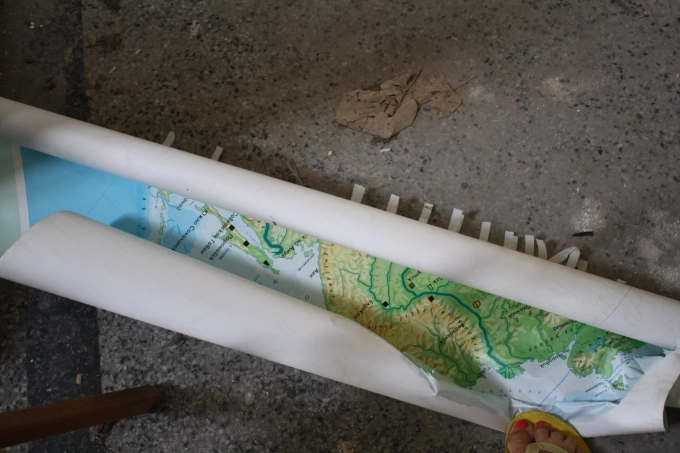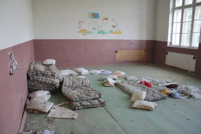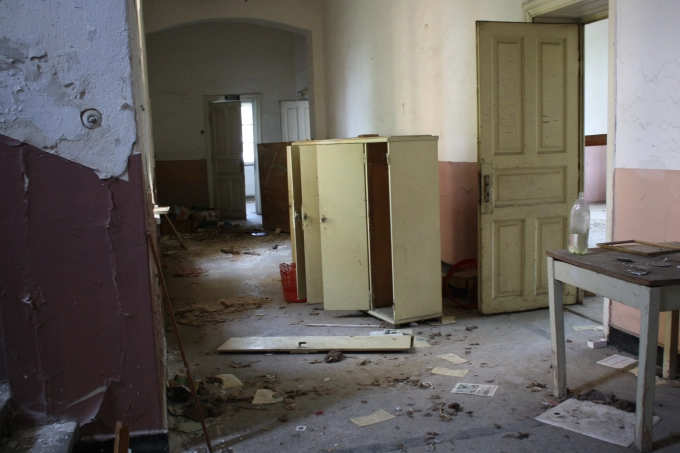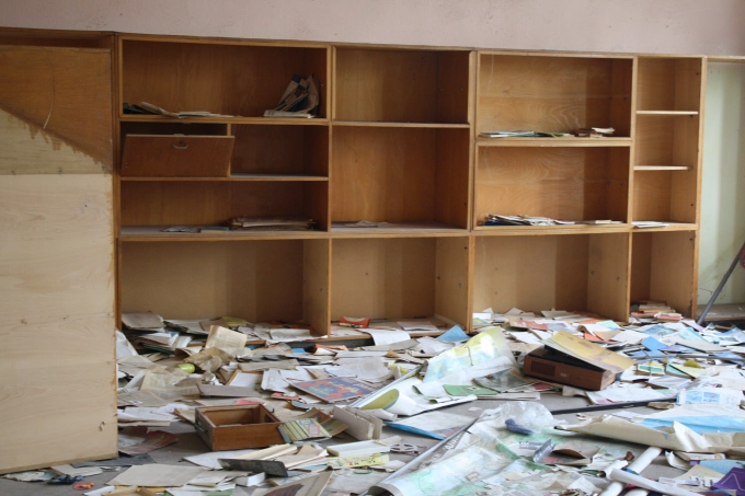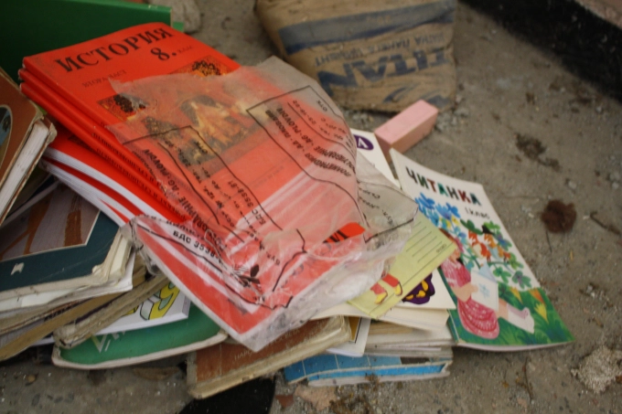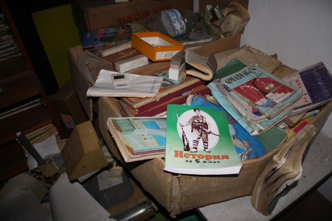 Продължавам с кървящи стъпки към вратата, някога заключена с катинар. Днес катинарът виси безполезен на едното й крило. Две крачки навътре и попадам на купчина учебници, повечето чисто нови, неотваряни. Има цял стек История за 8 клас. Малко встрани се търкаля навита на руло географска карта на България, от онези големите, пред които и мен са изпитвали. Чисто нова е била, вижда се от пръв поглед. Не е ясно защо не е в някоя друга класна стая, където все още има деца.